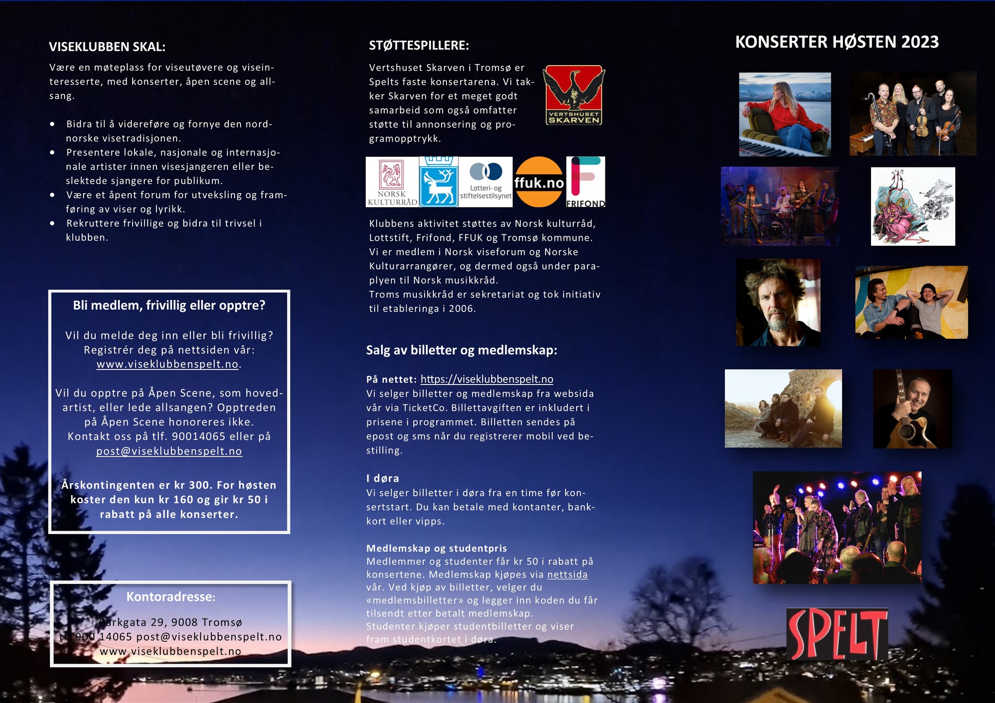 I høst har vi åtte konserter. Det hele starter med Lars Martin Myhre og Perry Stenbäck 20. september. Bergenseren Doddo kommer 27.09. og vi feirer selvfølgelig vår styreleder Ragnar Olsen med 70 år, med konsert både 13. og 14.10. Andre er Katia Cardenal, Habeneroz og sist men ikke minst: Frida Ånnevik og Moddi - begge med samarbeid med Arktisk Filharmoni! Semesteret avsluttes med Romjulsspelt med bokna musikk. Mye å glede seg til, med andre ord!
