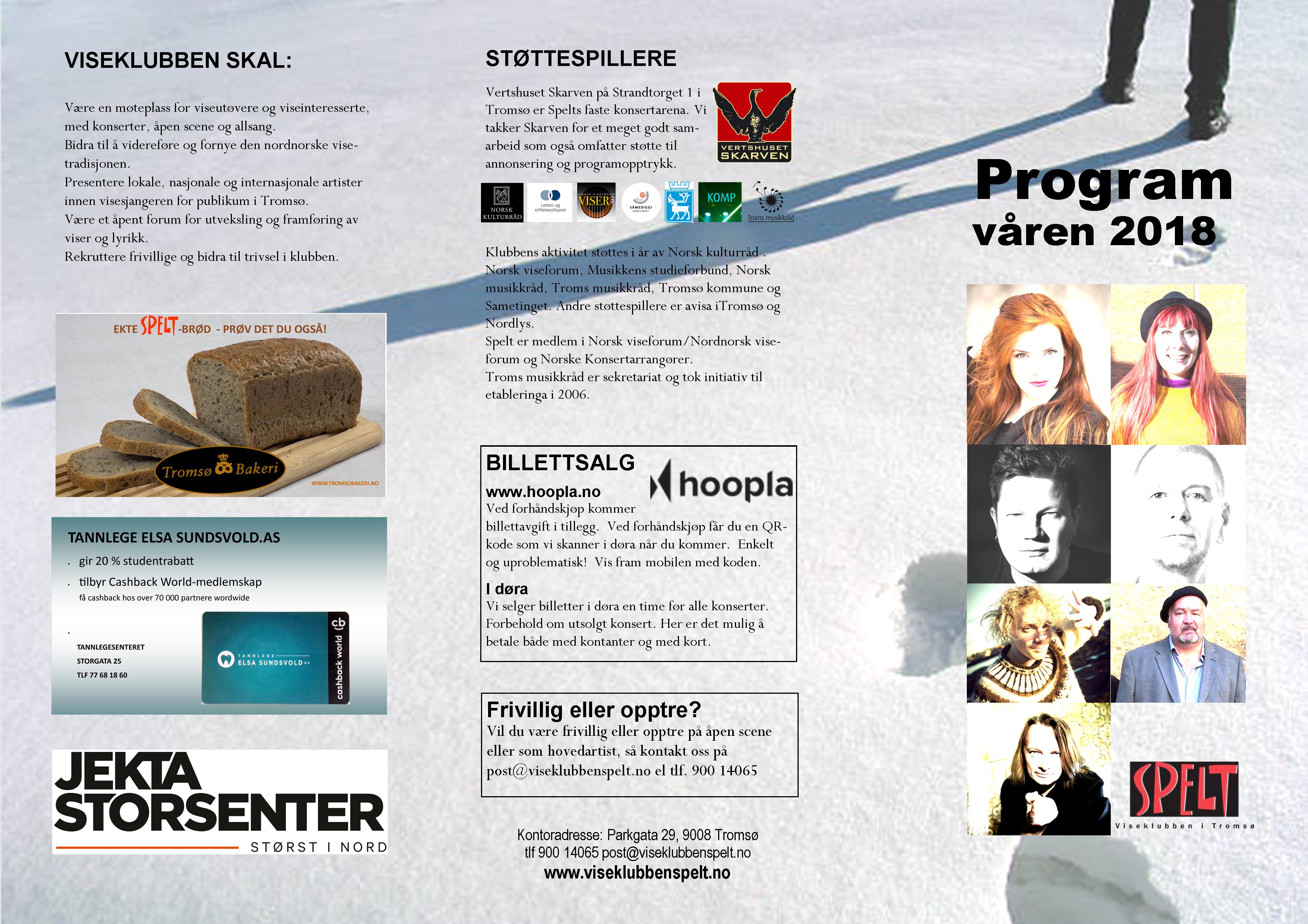 Nå er vårprogrammet ute, og først ut er Jan Eggum lø.13. januar på Skarven. Denne konserten er utsolgt. I februar opptrer Niko Valkeapää og Georg Buljo, og videre Karoline Amb, Trygve Beddari, Dagfinn Nordbø, Heidi Solheim og sist, men ikke minst: MODDI!