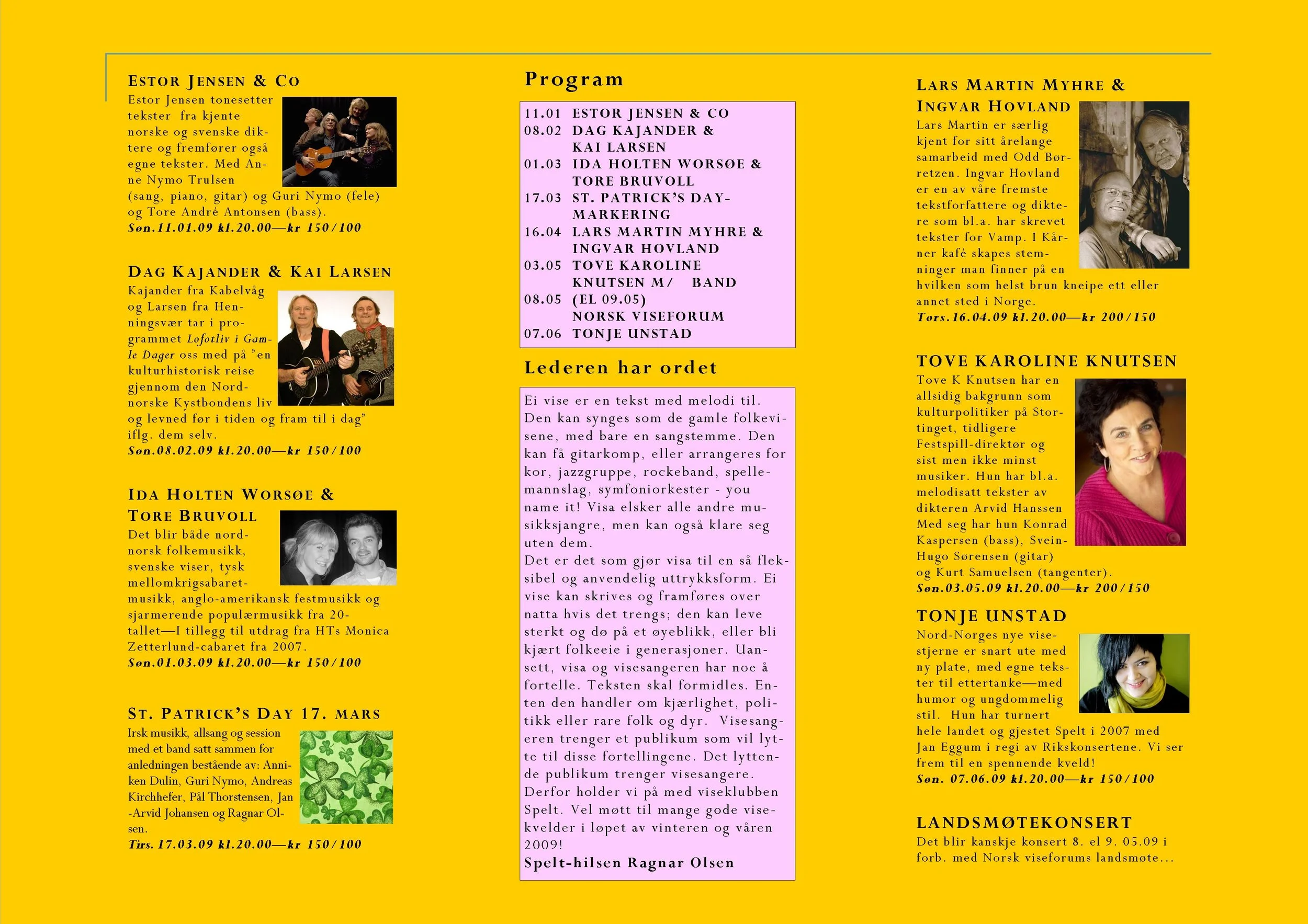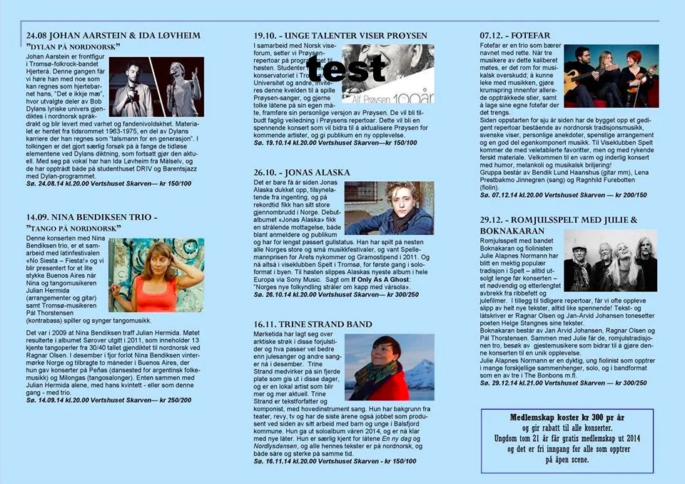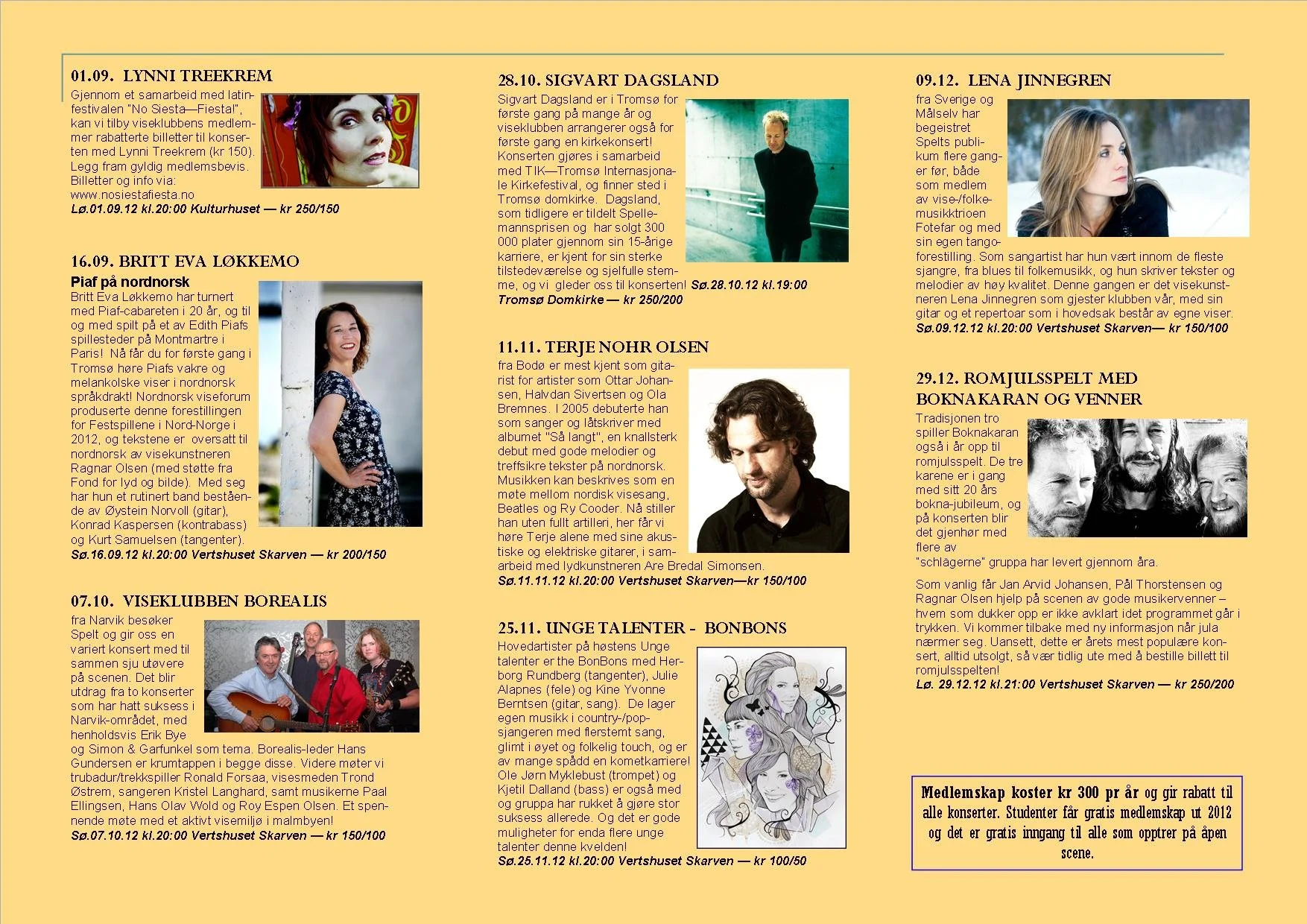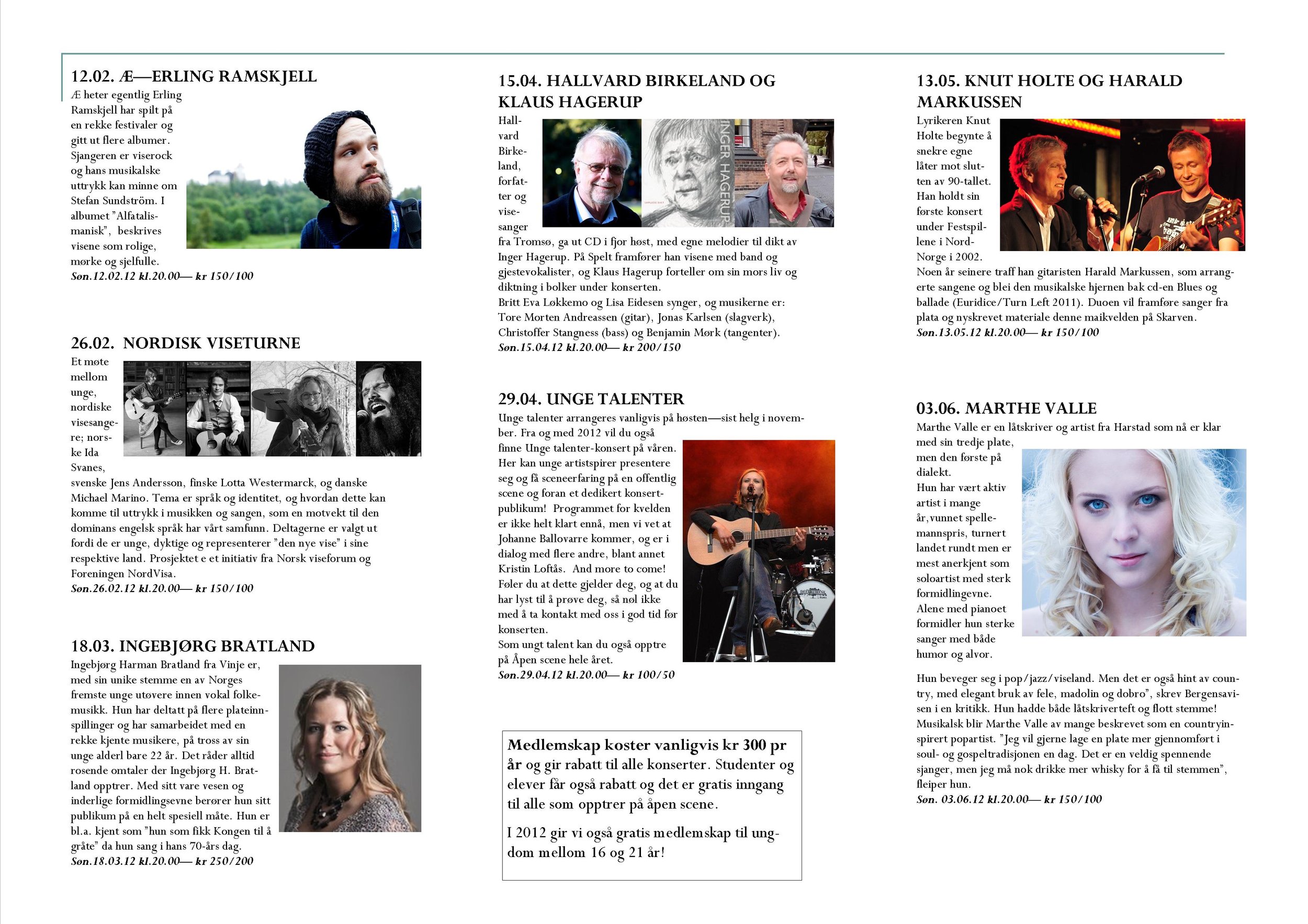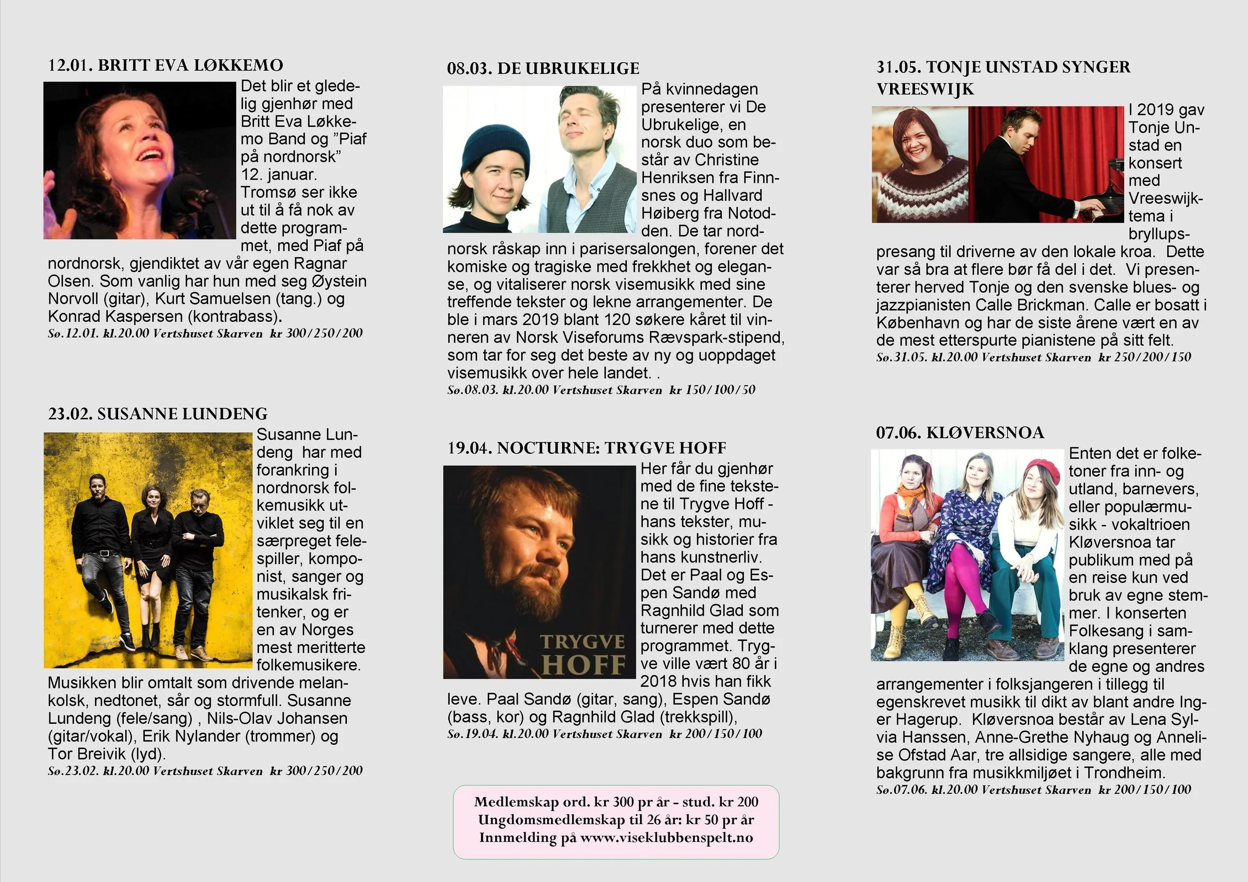 Viseklubben ble etablert i 2006 og begynte å trykke program fra 2009. Vi arrangerer fra 15–20 konserter årlig unntatt juli og august. Programmet vedtas av styret. Har du noen forslag, så kan du sende dem til oss.