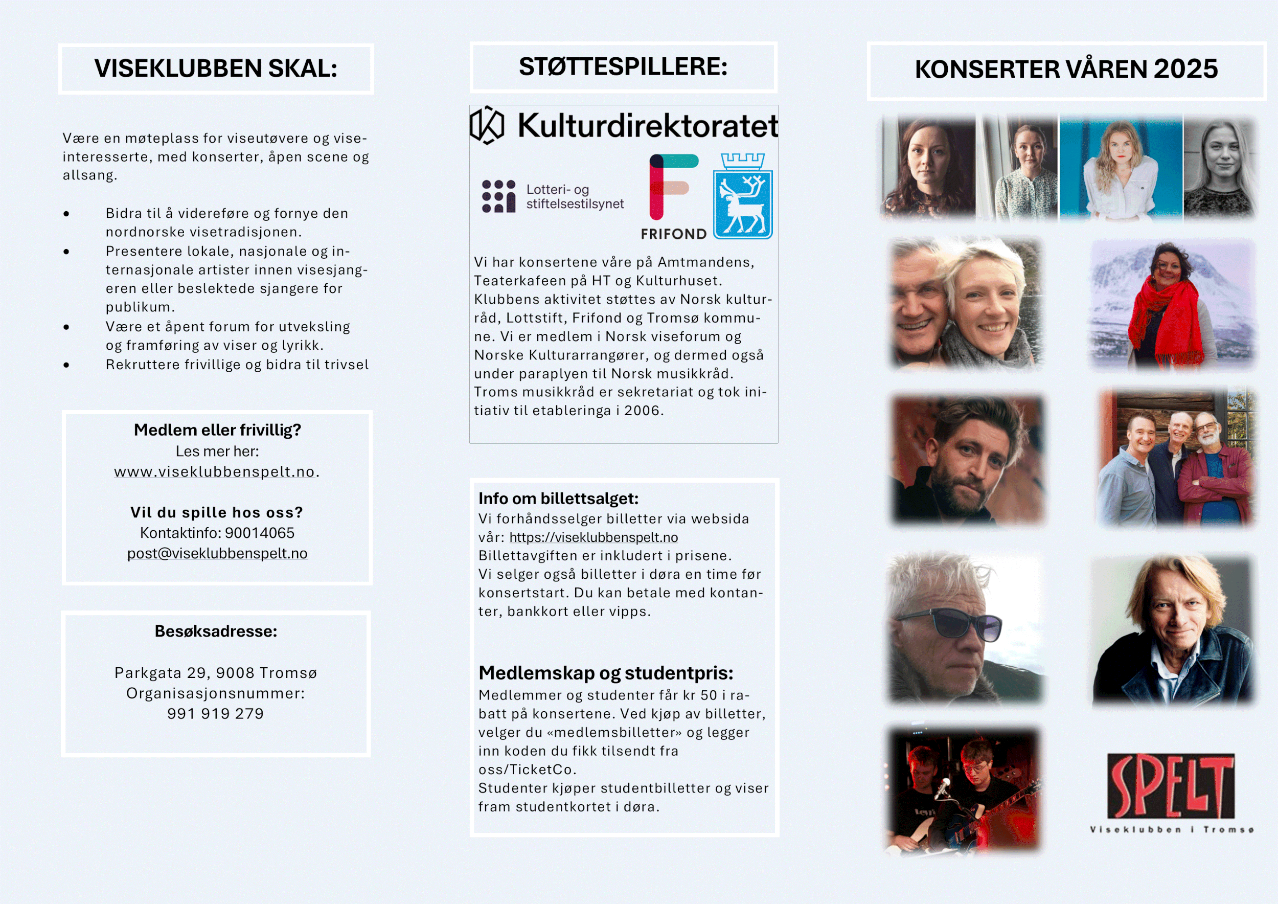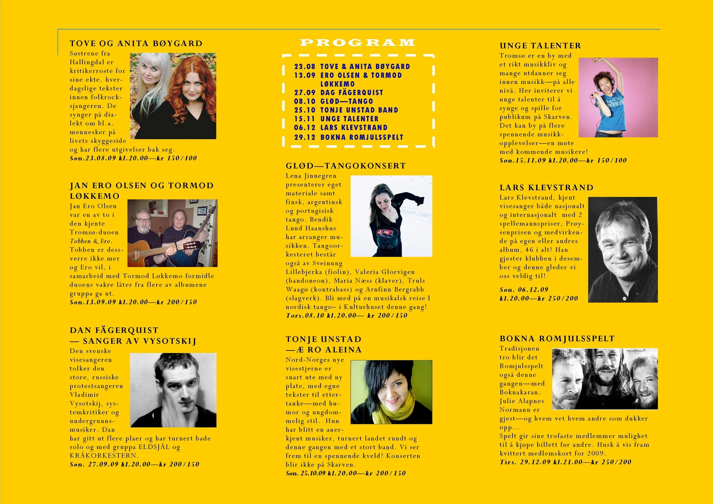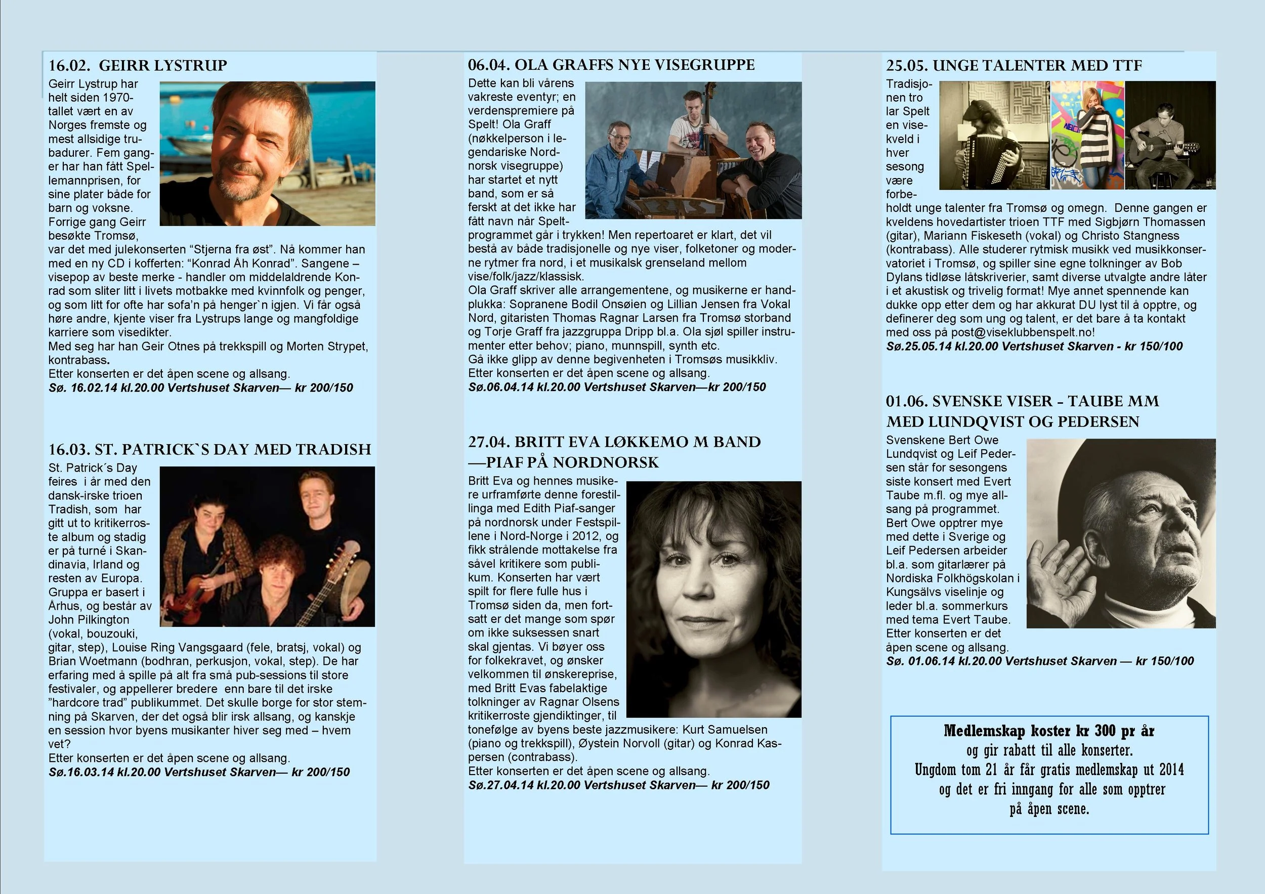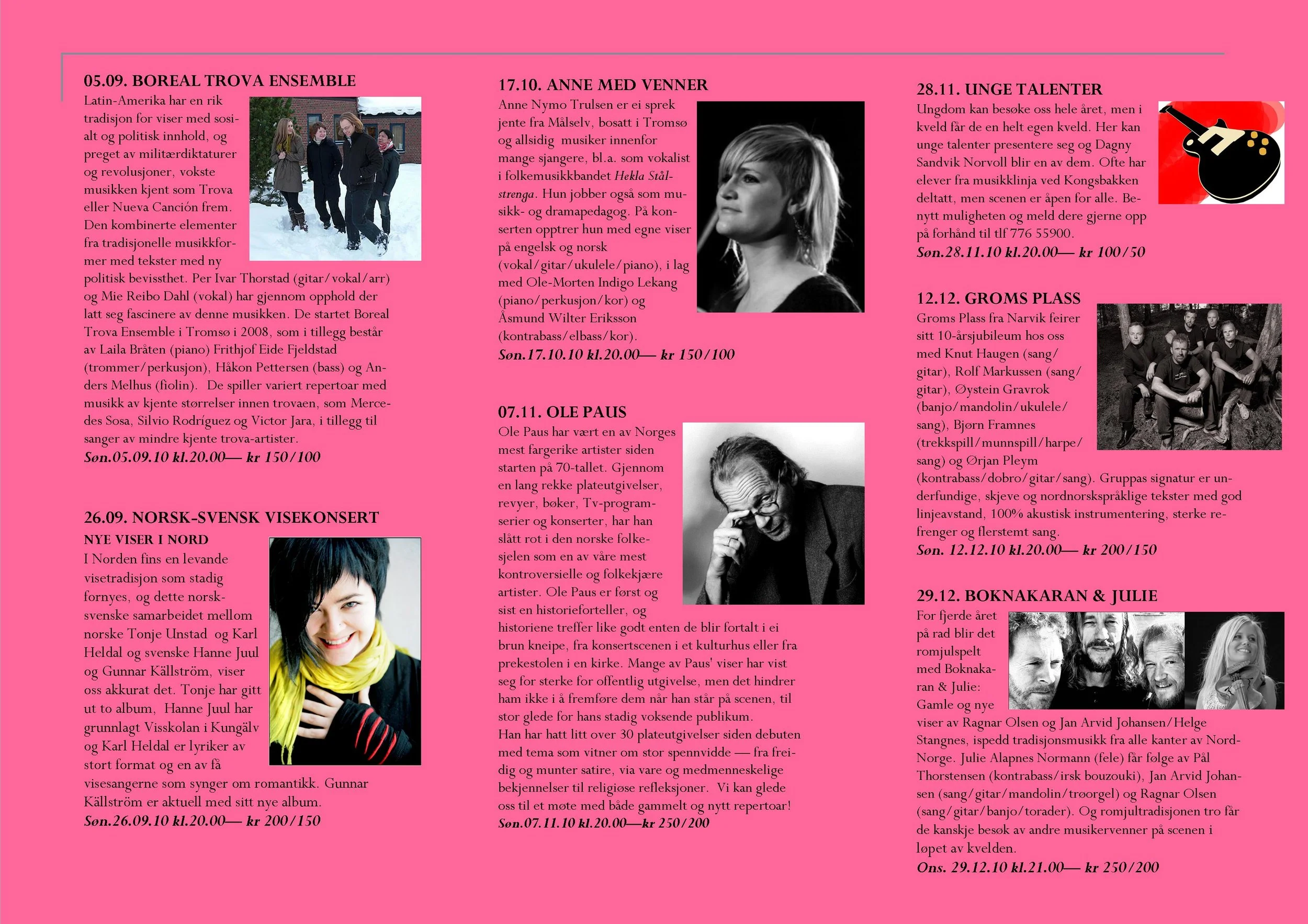 Viseklubben ble etablert i 2006 og begynte å trykke program fra 2009. Vi arrangerer fra 15–20 konserter årlig unntatt juli og august. Programmet vedtas av styret. Har du noen forslag, så kan du sende dem til oss.