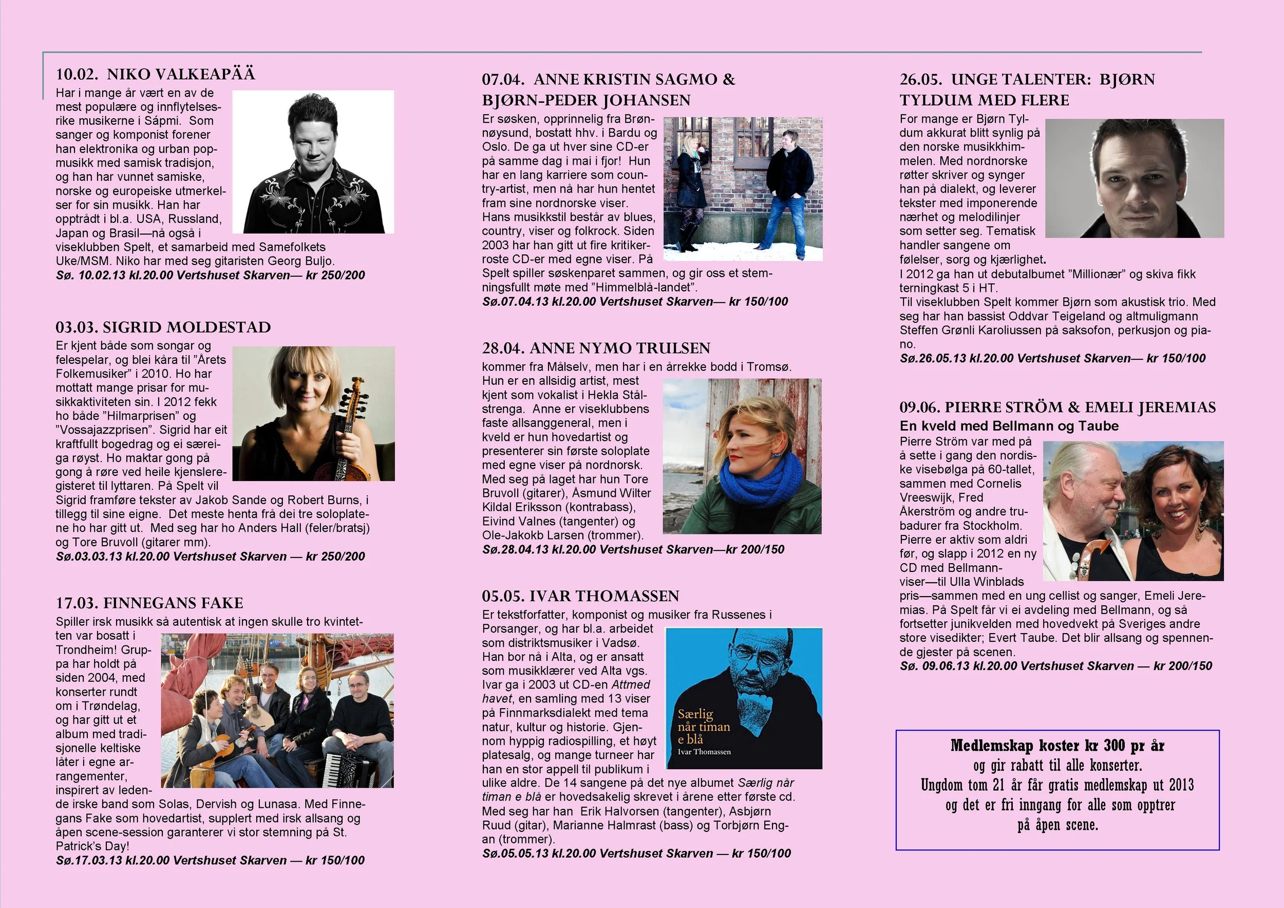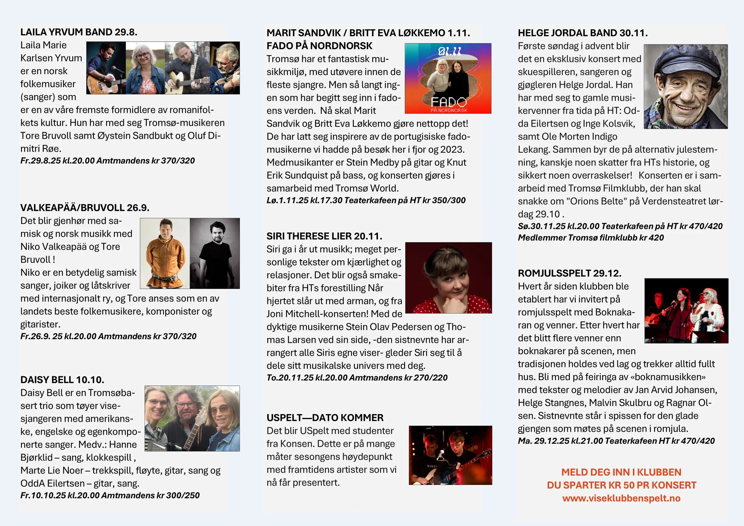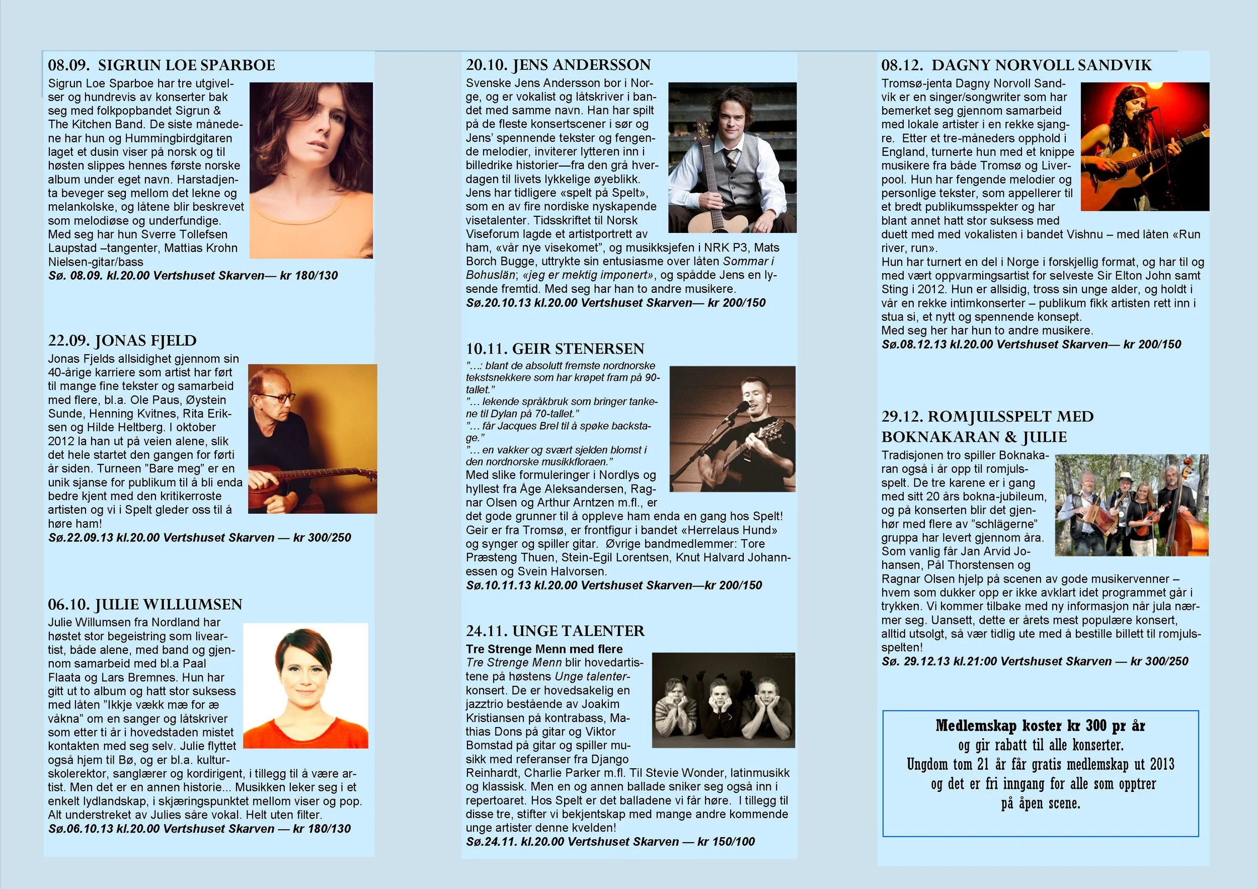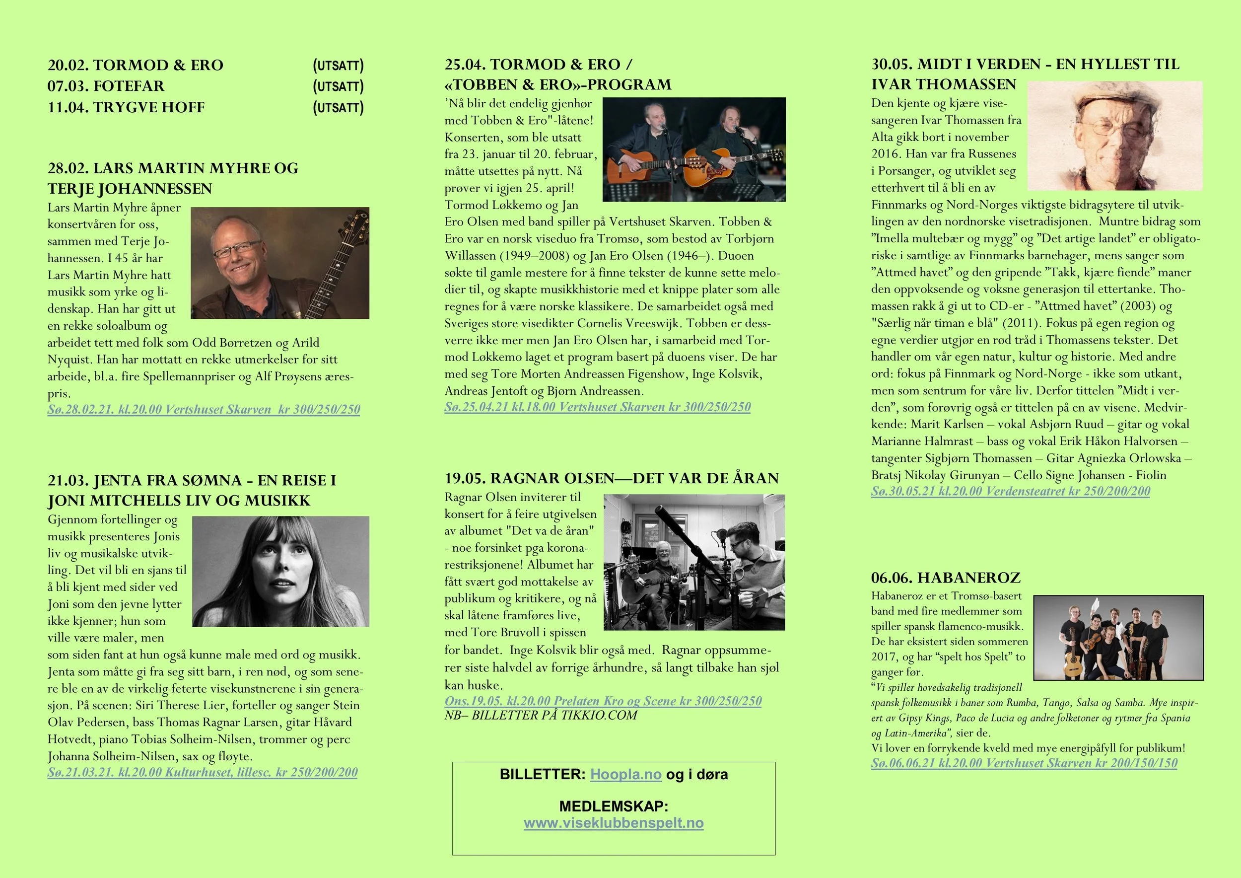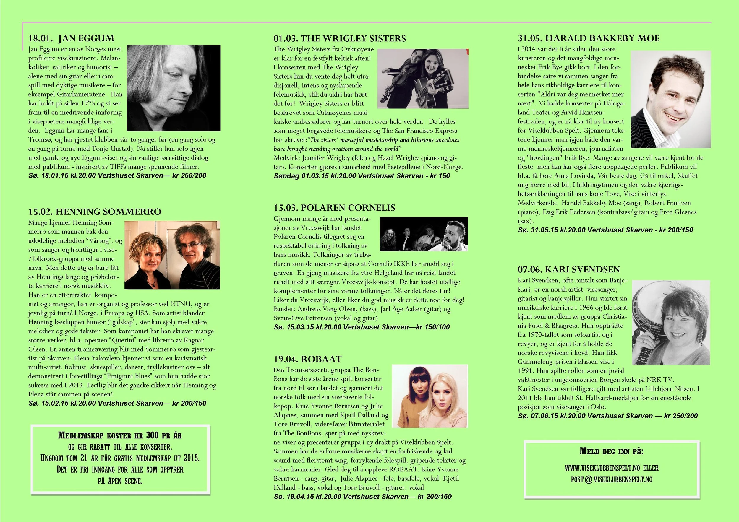Viseklubben ble etablert i 2006 og begynte å trykke program fra 2009. Vi arrangerer fra 15–20 konserter årlig unntatt juli og august. Programmet vedtas av styret. Har du noen forslag, så kan du sende dem til oss.